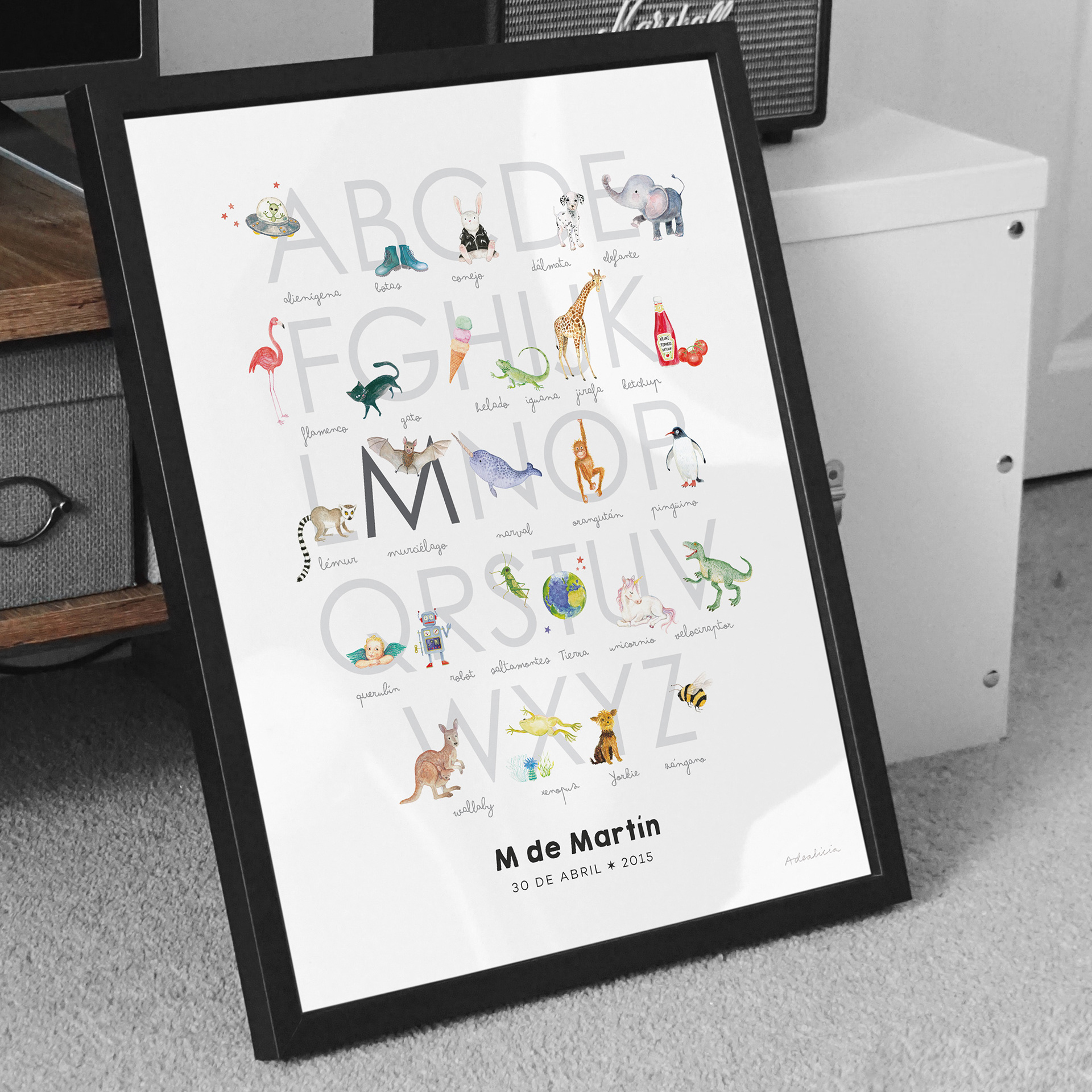 En la página se incluyen mis obras originales en acuarela, así como distintos tipos de láminas especialmente diseñadas para la habitación infantil —inicial del nombre, abecedarios, mapamundis, etc.— tanto en español como en inglés, decoradas con animales y plantas. La mayoría de las composiciones son personalizadas y por encargo, incluyendo el nombre del bebé o del niño, así como su fecha de nacimiento.
