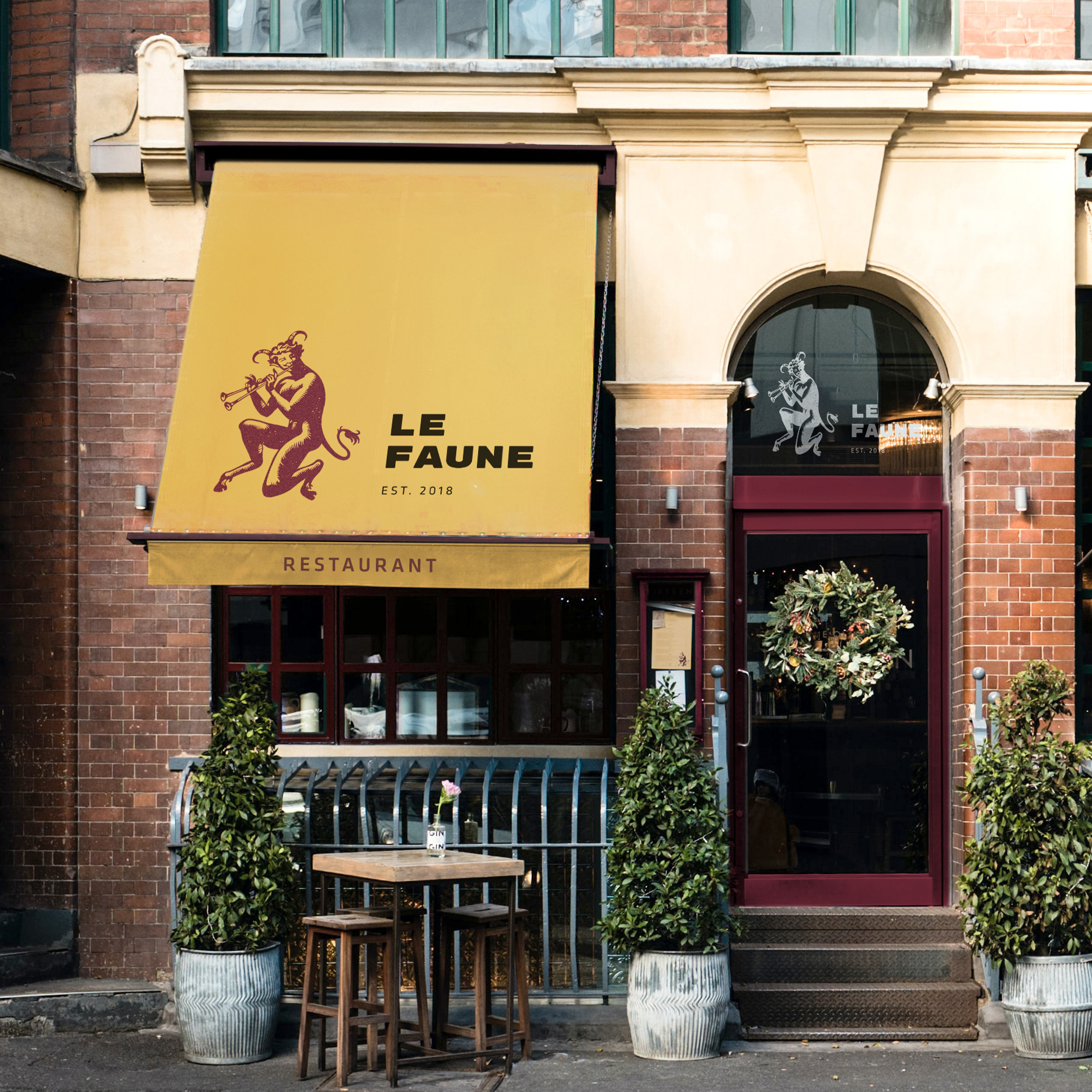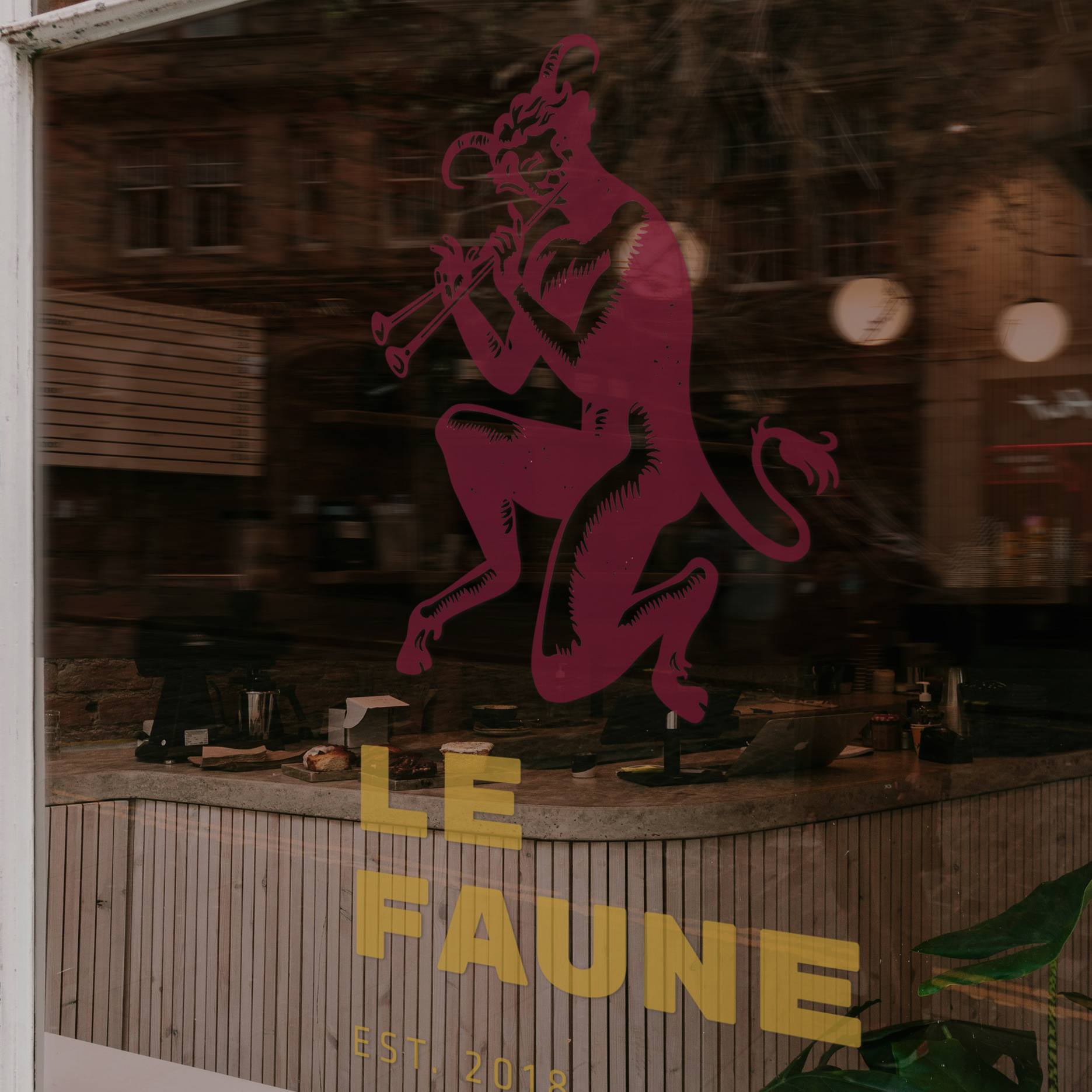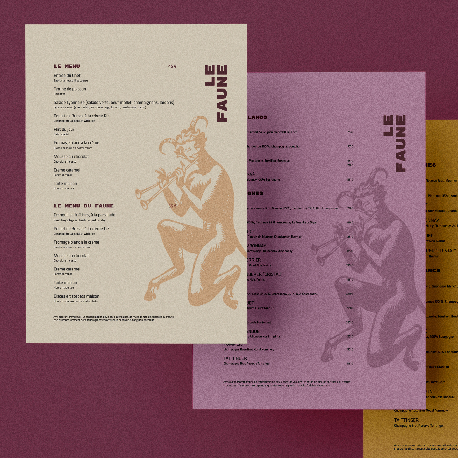 Propuesta de diseño de marca para el restaurante Le Faune. El proyecto incluye la ilustración de la figura de un fauno pícaro y elegante para el logotipo –en estilo litográfico– así como la cartelería, elementos de papelería y diseño gráfico de la carta.